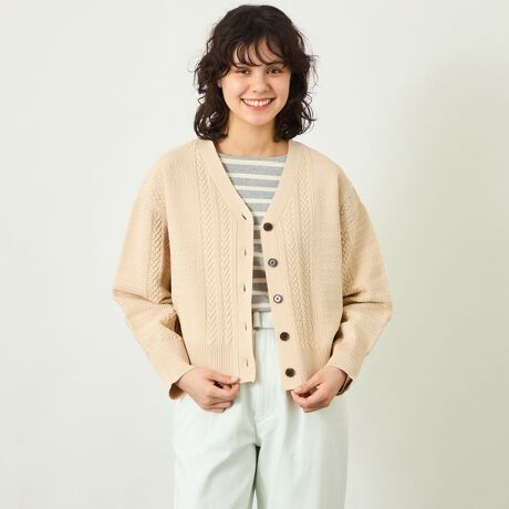 一枚で主役にあるワイドケーブル柄を配したVネックカーディガン。