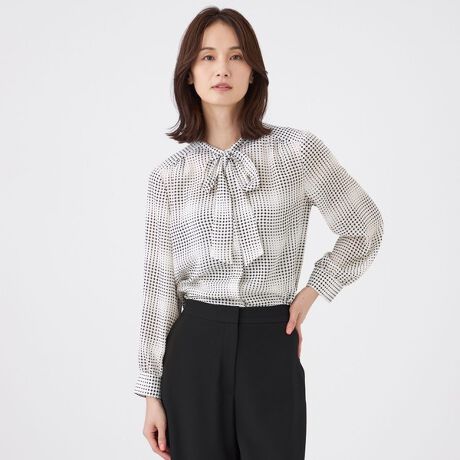 シンプルでクラシックなランダムドットのボウタイ付きブラウスです。