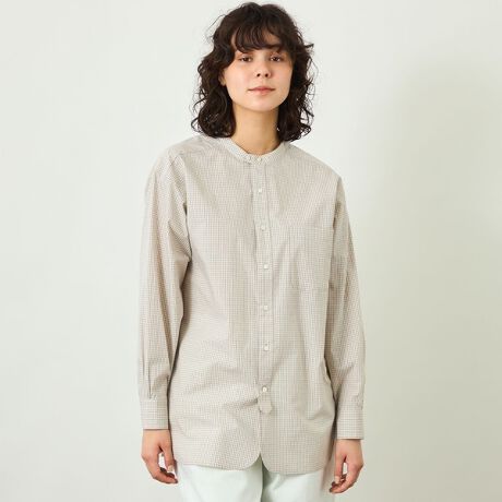 ミリタリードレスシャツをイメージしたオーバーシルエットのバンドカラーシャツ。長めのレングスと深くラウンドしたフロント&サイドのカッティングがクラシカルなデザインアクセント。衿の持ち出しと角落としの胸ポケットで少しミリタリーテイストを加えています。衿釦を2個留めると首元のアクセントに。