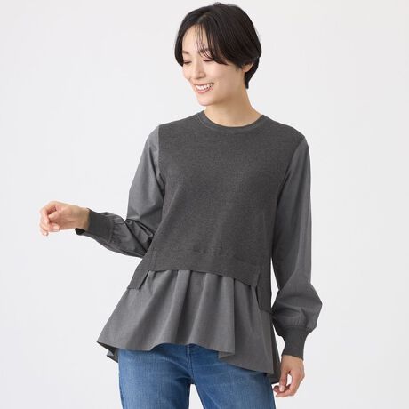 コンパクトなニットの裾ラインから広がるシャツ素材のペプラムシルエットが魅力的なプルオーバー。袖も同様に腕が綺麗に見えるよう、程良い分量感のギャザースリーブに。身頃のニット部分は畦組織柄を施し、前後のイレギュラーな丈感でペプラムの分量やフレアの入り方にもこだわったシルエットが着用時のアクセントに。デイリーカジュアルなスタイルにおすすめのコンビネーションニットです。