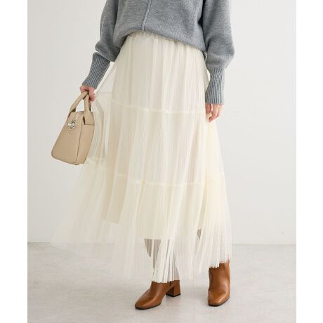 シアーなチュール素材で軽やかに仕立てたデザインスカート。たっぷりのギャザーを施したティアードシルエットがふんわりと揺れ動き、シンプルなトップスと合わせるだけで華やかに演出します。裏地付きで透けにくく、ウエストゴムのリラクシーな穿き心地もポイント。デイリーにはもちろん、セレモニーやパーティーシーンにも活躍するおすすめのアイテムです。透け感[ややあり]