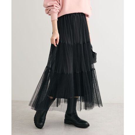 シアーなチュール素材で軽やかに仕立てたデザインスカート。たっぷりのギャザーを施したティアードシルエットがふんわりと揺れ動き、シンプルなトップスと合わせるだけで華やかに演出します。裏地付きで透けにくく、ウエストゴムのリラクシーな穿き心地もポイント。デイリーにはもちろん、セレモニーやパーティーシーンにも活躍するおすすめのアイテムです。透け感[ややあり]
