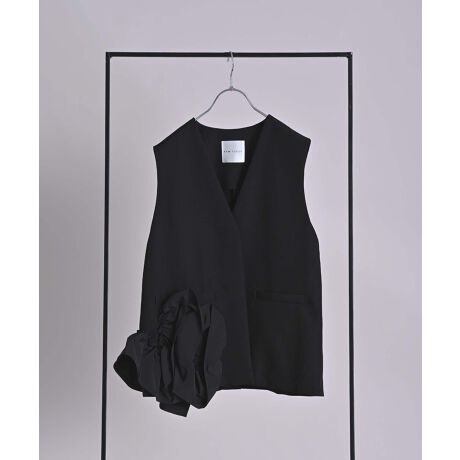 ハリのあるダブルクロスの身頃に、メモリータフタのフリルモチーフをアシンメトリーに配置したデザインジレ。