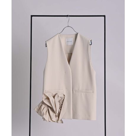 ハリのあるダブルクロスの身頃に、メモリータフタのフリルモチーフをアシンメトリーに配置したデザインジレ。