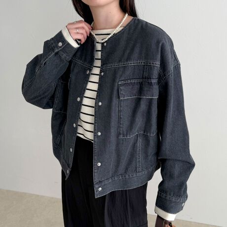 軽やかな着心地が魅力のノーカラーデニムジャケット