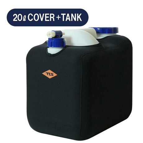 サーフィンや海水浴などウォータースポーツや、アウトドアや防災用途としても活躍する「ポリタンク用保温保冷ネオプレン素材のカバー」とポリタンク本体のセット。