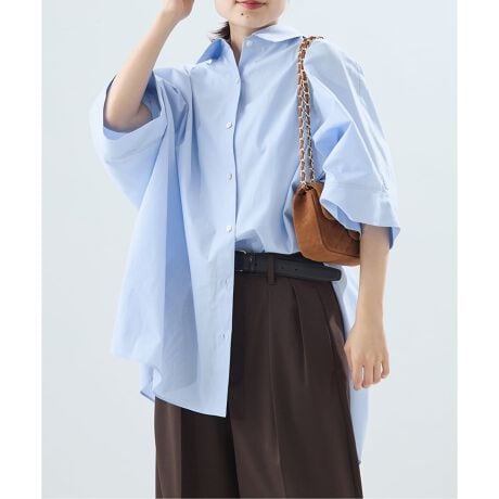 レギュラーカラーできっちりとした見た目にもかかわらず、ゆったりして涼し気なシャツブラウス。