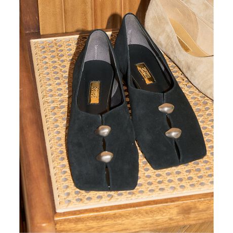 スリットデザインでセンシュアルなムードを出しつつ、ワイドスクエアトウとARTYなメタルパーツでモード感をプラス。