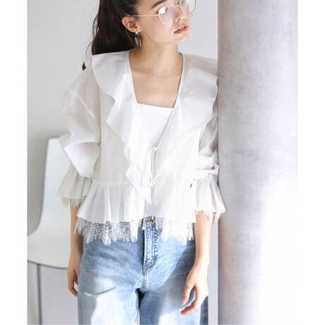 繊細なレース使いとフリルディテールが目を惹く、華やかなレースブラウス。