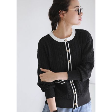 ケーブル編みの立体感が上品なニットカーディガン。