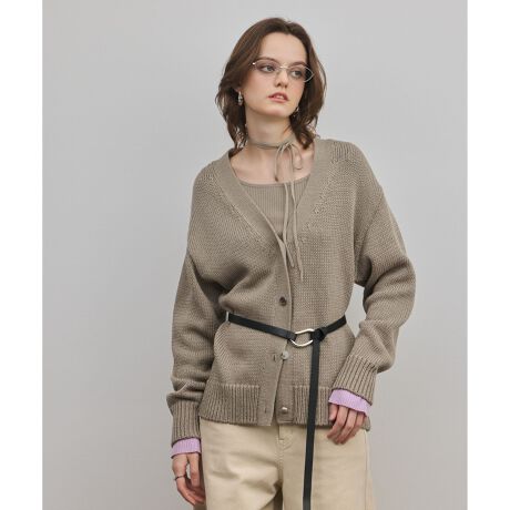 [型番:0326153316]綿素材のリリヤーン糸。リラックス感のあるサイジングのニットカーディガン。同カラーでおつくりしたバイカラーリブニットトップ【品番:0326143318】のご用意もございます。※こちらのモデル着用画像はサンプル品を撮影しております。実際の商品と仕様、加工、サイズが若干異なる場合がございます。予めご了承くださいませ。