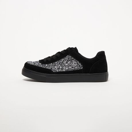 シンプルなパンツと合わせ、グリッターの輝きを引き立たせたコーディネートがおすすめ。