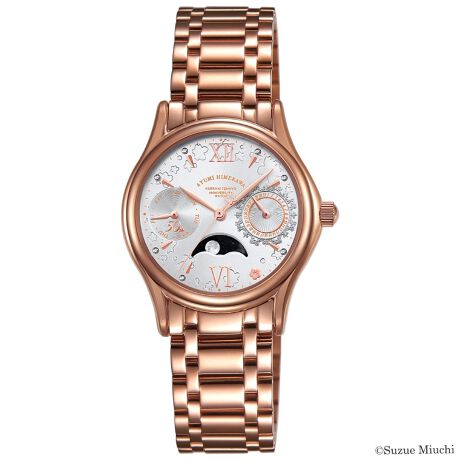 文字盤には梅の花芽をイメージしたインデックスと7石のメレダイヤモンドを配し、秒針や装飾には梅の花をモチーフとした意匠を施しています。