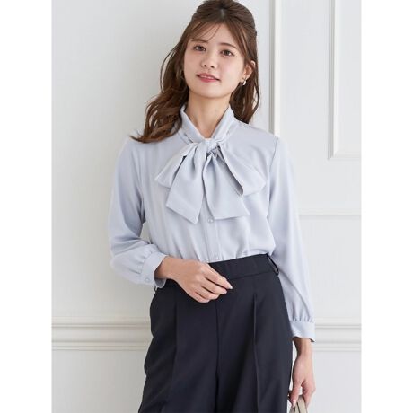 [型番:25580040527]フロントのボウタイがフェミニンなムードを放つブラウス。着用時にシワになりにくい素材を使用しており、お手入れも簡単です。ご家庭でラクに洗えるマシンウォッシャブル仕様が魅力。スカートやスラックスと合わせたきれいめなコーディネートがおすすめです。モデル(オフホワイト/青着用)身長:167cmMサイズ着用