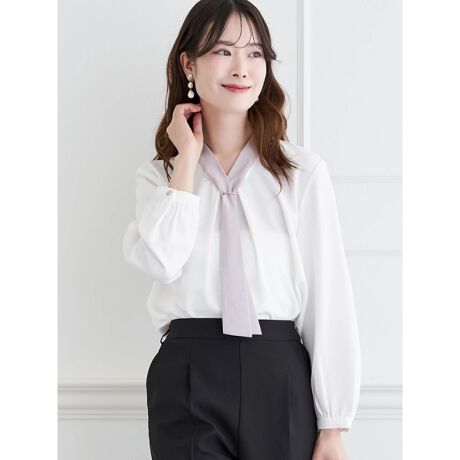 [型番:25580040577]フロントのメタルバーが煌びやかなアクセントになるブラウス。シワになりにくい素材を使用しているので、ご家庭で簡単にお手入れすることができます。さっと洗えるマシンウォッシャブル仕様が魅力的。休日のお出かけやオフィスカジュアルとしても活躍してくれるアイテムです。モデル(オフホワイト着用)身長:160cmMサイズ着用モデル(白着用)身長:167cmMサイズ着用
