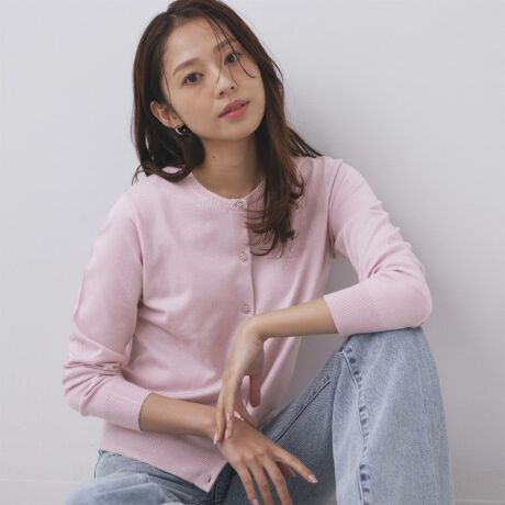さりげない飾り編みの衿ぐりがポイントのクルーネックニットカーディガン