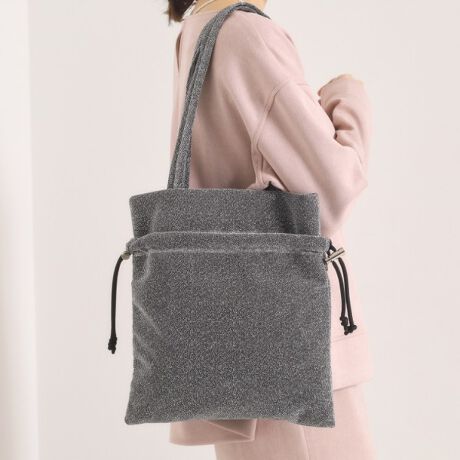 キラキラ素材で視線を集める華やかさ。ドロスト仕様の軽やかなトートバッグです。