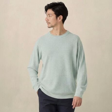 綿の自然な風合いと、ポリエステルの膨らみ・伸縮性を掛け合わせたメッシュ組織のクルーネックニットです。