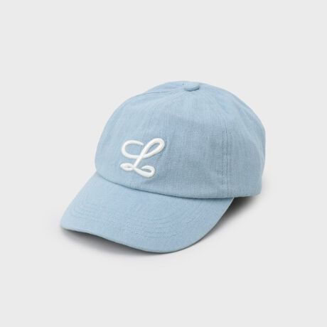 シンプルな形のデニムキャップにロゴを刺繍したキャップ