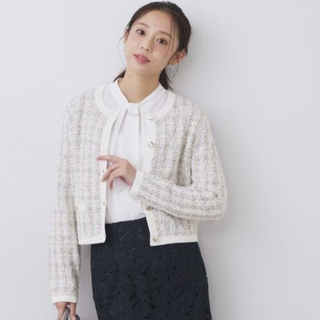ファンシーヤーンのツイード風編地が素敵なトリミングカーディガン