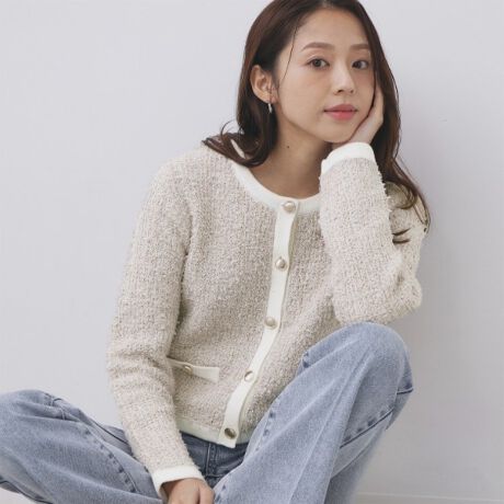 ファンシーヤーンのツイード風編地が素敵なトリミングカーディガン