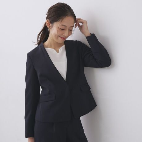 ・ノーカラーデザインが顔回りをすっきりと引き締める一方で、インナーとのコーディネートがしやすいシンプルな仕上がり。