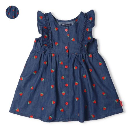 いちごの刺繍が春らしい!デニム素材のジャンパースカート、ジャンスカ。フリルがガーリーな印象です。【アイテム】トップス シンプル ガーリー フェミニン カジュアル お洒落 オシャレ かわいい 可愛い 普段着 デイリーウェア お出かけ着 お外着 お外遊び着 子ども こども 女児 女の子 ガールズ キッズ ベビーサイズ トドラーサイズ 幼稚園 保育園 小学校 通園 通学 小学生 2026年春物新作 丸高衣料 ネイビー 紺色 イチゴ 苺 フルーツ 果物 ムージョンジョン コットン100% 綿100%