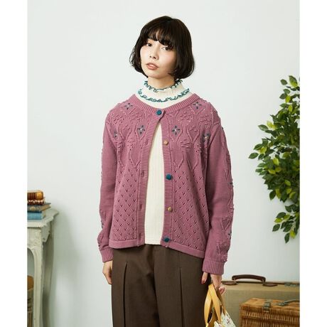 着回し力抜群なカーディガン。ベーシックなシルエットで一枚着風にも羽織りとしても活躍するひと品です。前身頃と両袖に柄編みを施し、場所によって表情の違いが楽しめるのも魅力。部分的にお花をイメージしたハンド刺繍や、配色くるみボタンにも注目。