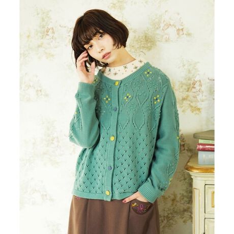 着回し力抜群なカーディガン。ベーシックなシルエットで一枚着風にも羽織りとしても活躍するひと品です。前身頃と両袖に柄編みを施し、場所によって表情の違いが楽しめるのも魅力。部分的にお花をイメージしたハンド刺繍や、配色くるみボタンにも注目。