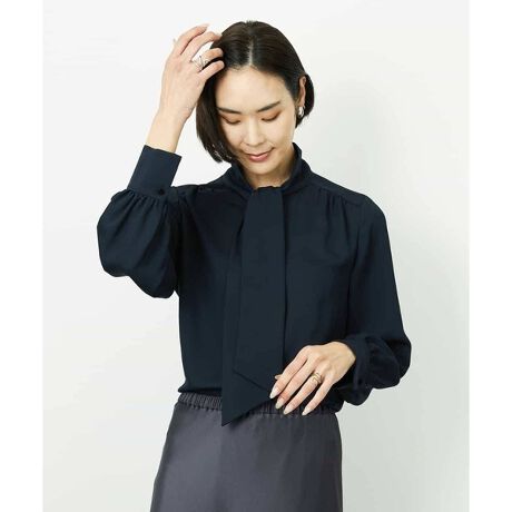 さっと着るだけで華やかさを演出でき、ジャケットのインナーとしてもボウタイが上品な印象をプラスしてくれます。オンスタイルのインナーとして重宝し、セレモニーやオケージョンシーンにも大活躍。デイリーな通勤スタイルにもボトムを選ばず合わせやすい一枚です。