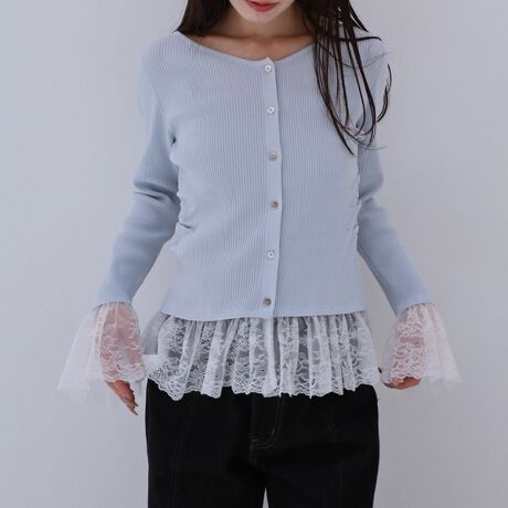 ・裾と袖にレースをあしらった、華やかなニットカーディガン