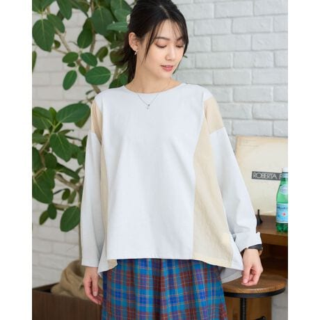 サイドに布帛素材を使用した異素材切替デザインカットソー。