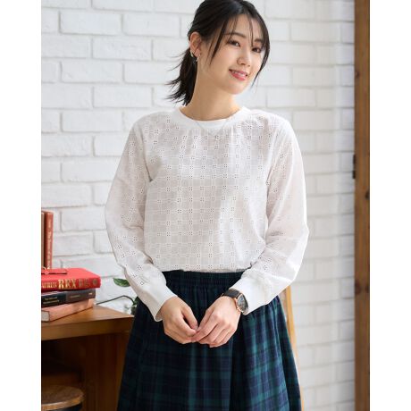 オーガニックコットンを使用したの格子柄レースを使用したブラウスで、襟ぐりと袖ぐりに別布リブを接ぐことでカットソーのような着心地を実現しています。
