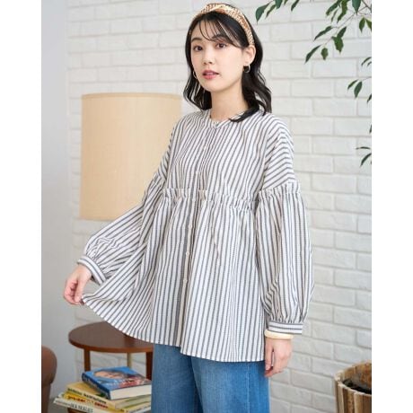 バスト下と二の腕にあしらったギャザーで、ふんわりと立体感が増し、フロントを開け羽織ってお召しになっても素敵です。