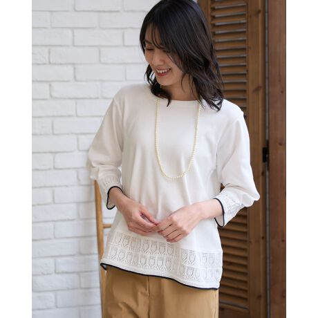 袖口と裾にあしらった透かし柄のニットが上品なデザインカットソーです。