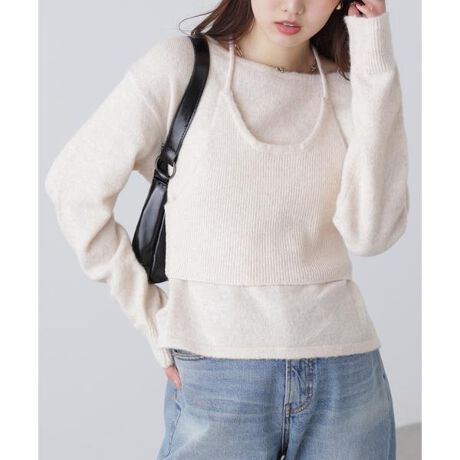 ルーズプルオーバーとホルターネックビスチェのSET。それぞれ単品使いも可能ですが、プルオーバーの上からビスチェをレイヤードしたスタイルがおすすめです。ウール混のモチモチとした肌触りで暖かみのある糸を使用。プルオーバーはさらりとした天竺編み、ビスチェは伸縮性のあるリブ編みです。ホルターネックはバストでとまるよう背面に平ゴムを内蔵。デザイン性があるニットなので、デニムパンツやチノパンツ、スウェットパンツとのスタイリングがおススメです。※モデルの着用画像の場合、光の当たり具合により、実際の色味と異なって見えることがございます。色味は、商品単体の画像をご参照ください。