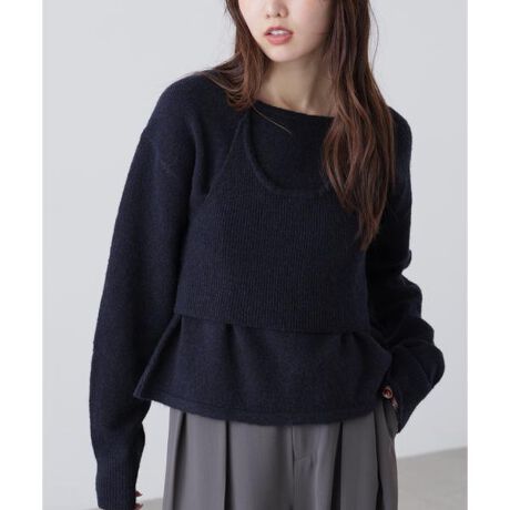 ルーズプルオーバーとホルターネックビスチェのSET。それぞれ単品使いも可能ですが、プルオーバーの上からビスチェをレイヤードしたスタイルがおすすめです。ウール混のモチモチとした肌触りで暖かみのある糸を使用。プルオーバーはさらりとした天竺編み、ビスチェは伸縮性のあるリブ編みです。ホルターネックはバストでとまるよう背面に平ゴムを内蔵。デザイン性があるニットなので、デニムパンツやチノパンツ、スウェットパンツとのスタイリングがおススメです。※モデルの着用画像の場合、光の当たり具合により、実際の色味と異なって見えることがございます。色味は、商品単体の画像をご参照ください。