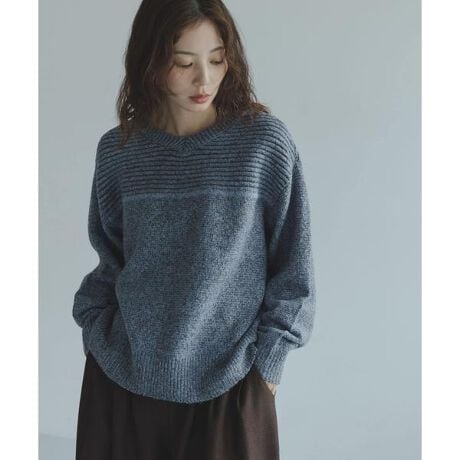 前後でベーシックなクルーネック、程よい開きのVネックと二通りの着こなしが楽しめるニットプルオーバー。