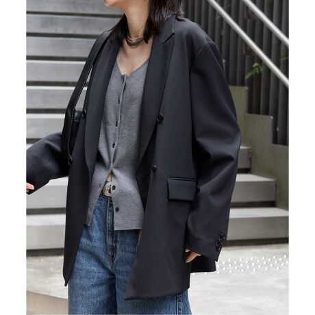 ダブル仕様でピークドラペルのマスキュリンなデザイン、素材の柔らかさと絶妙なサイズ感で、かっこよくも女性らしくも着こなせます。