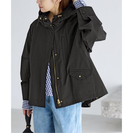 フード付きデザインながら、ゴールドカラーの金具やすっきりとしたディテールで、カジュアルになりすぎず大人が着やすいバランスに仕上げています。