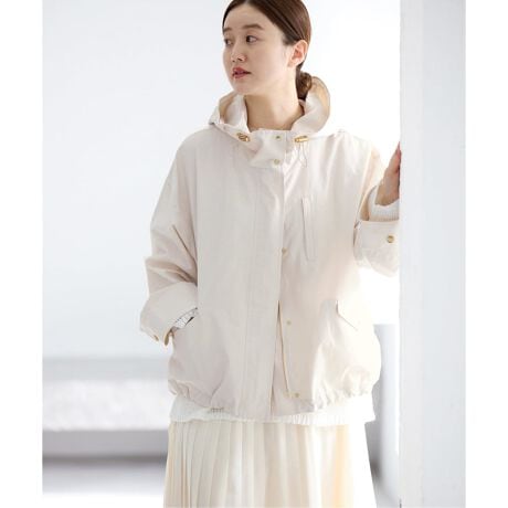 フード付きデザインながら、ゴールドカラーの金具やすっきりとしたディテールで、カジュアルになりすぎず大人が着やすいバランスに仕上げています。