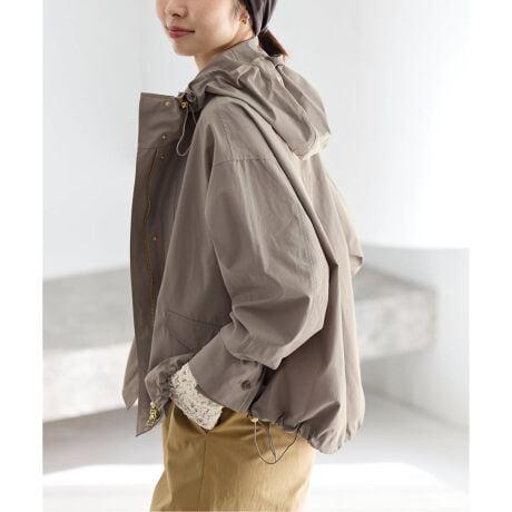 フード付きデザインながら、ゴールドカラーの金具やすっきりとしたディテールで、カジュアルになりすぎず大人が着やすいバランスに仕上げています。