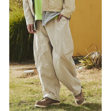 ゆったりとしたワタリから裾にかけて自然に落ちる立体的なシルエットが特徴で、リラックス感がありながらも野暮ったく見えないバランスに仕上げています。膝周りには切り替えを入れることで、動きやすさと立体感を両立。腰、裾にはドローコードを配し、シルエットの調整も可能です。