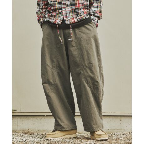 ゆったりとしたワタリから裾にかけて自然に落ちる立体的なシルエットが特徴で、リラックス感がありながらも野暮ったく見えないバランスに仕上げています。膝周りには切り替えを入れることで、動きやすさと立体感を両立。腰、裾にはドローコードを配し、シルエットの調整も可能です。