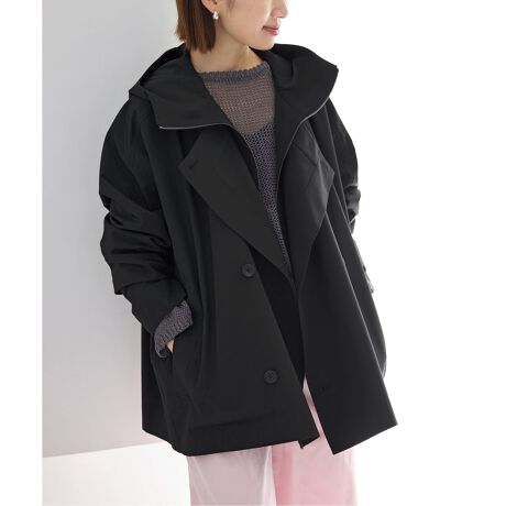 張りのある素材感と高めの衿フードが立体感のあるシルエットを演出し、