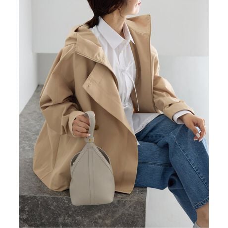 前身頃はベストを重ねたようなレイヤードデザインで、ボタンを開けるとトレンチコートを羽織ったような表情に。