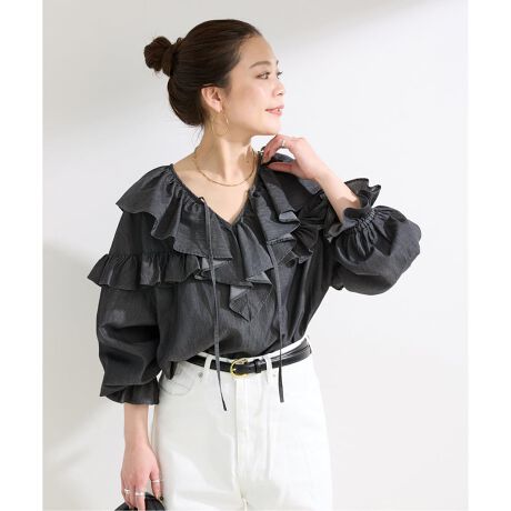 女性っぽさと抜け感がでるVネック開きにラッフルカラーをあしらい、顔まわりを華やかな印象にしてくれます。身頃と袖にもフリルを施し、動くたびにやさしく揺れる表情をプラス。袖はキャンディースリーブで程よいボリュームでフェミニン感があり、デニムの素材が甘さを抑えてくれ、程よいカジュアル感と軽さが出ます。