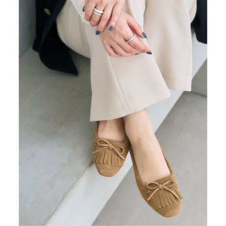 トレンドのボヘミアンムードなスタイリングに取り入れたい、フリンジディテールのフラットシューズ。