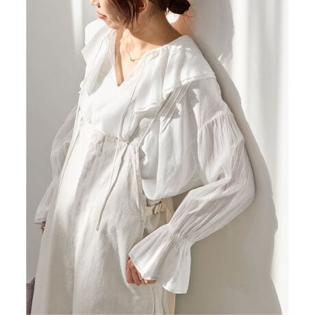 フリルカラーが顔まわりを華やかに演出する、表情豊かなブラウス。