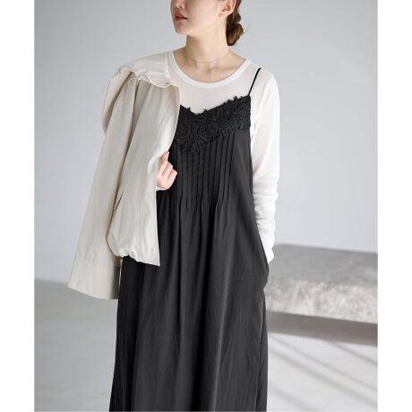 前後のピンタックとケミカルレースがアクセントのキャミソールワンピース。